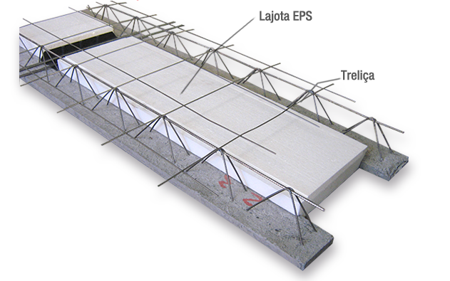 Cuidados: Durante a concretagem, ande sobre tábuas apoiadas nas vigotas e não acumule grandes montes de concreto localizado para não sobrecarregar as vigotas e as lajotas em EPS.